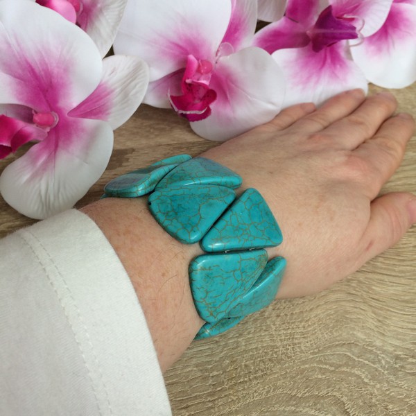 Náramok Tyrkys je na gumičku,plochý tvar trojuholníky.Veľkosť náramku 15cm.